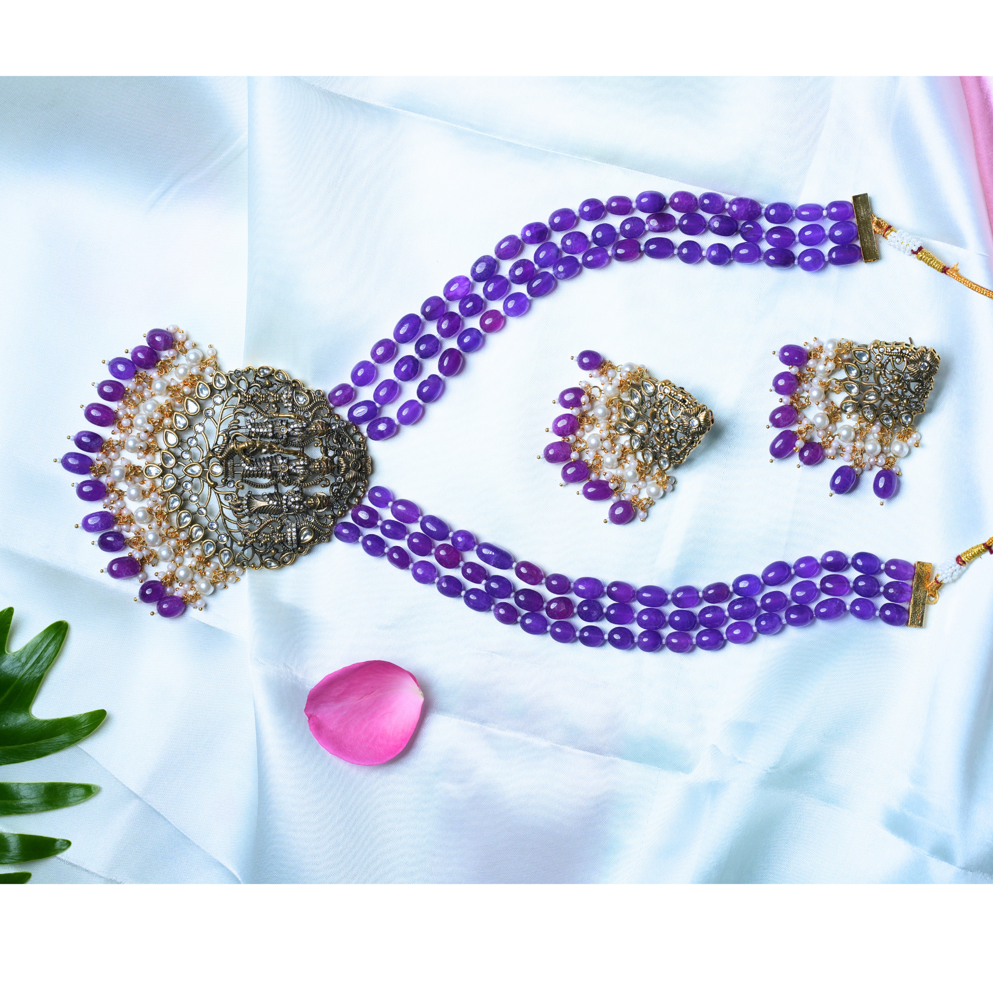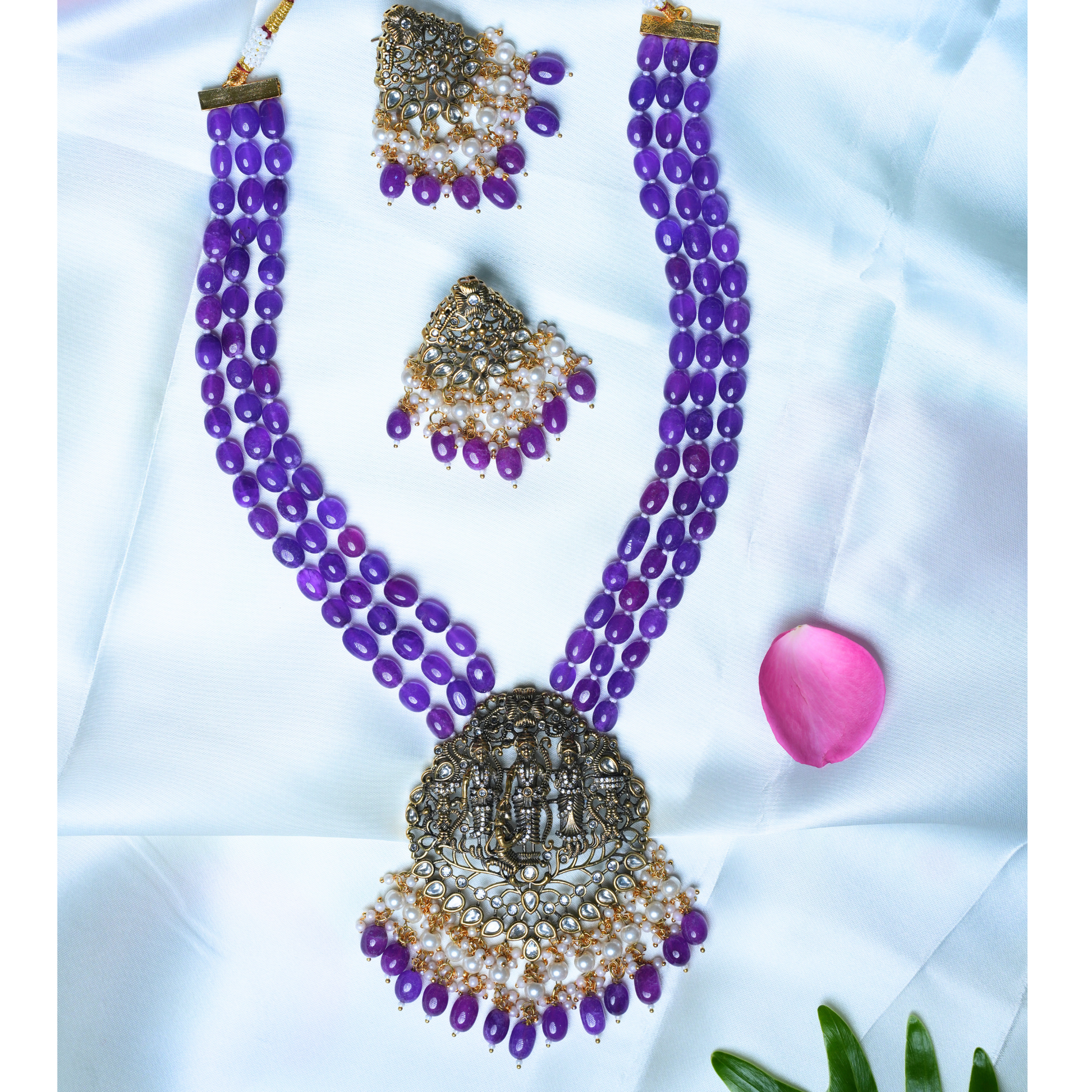 Elegant Ramparivar Purple Bead Haram Set with Victorian Pendant & Earrings