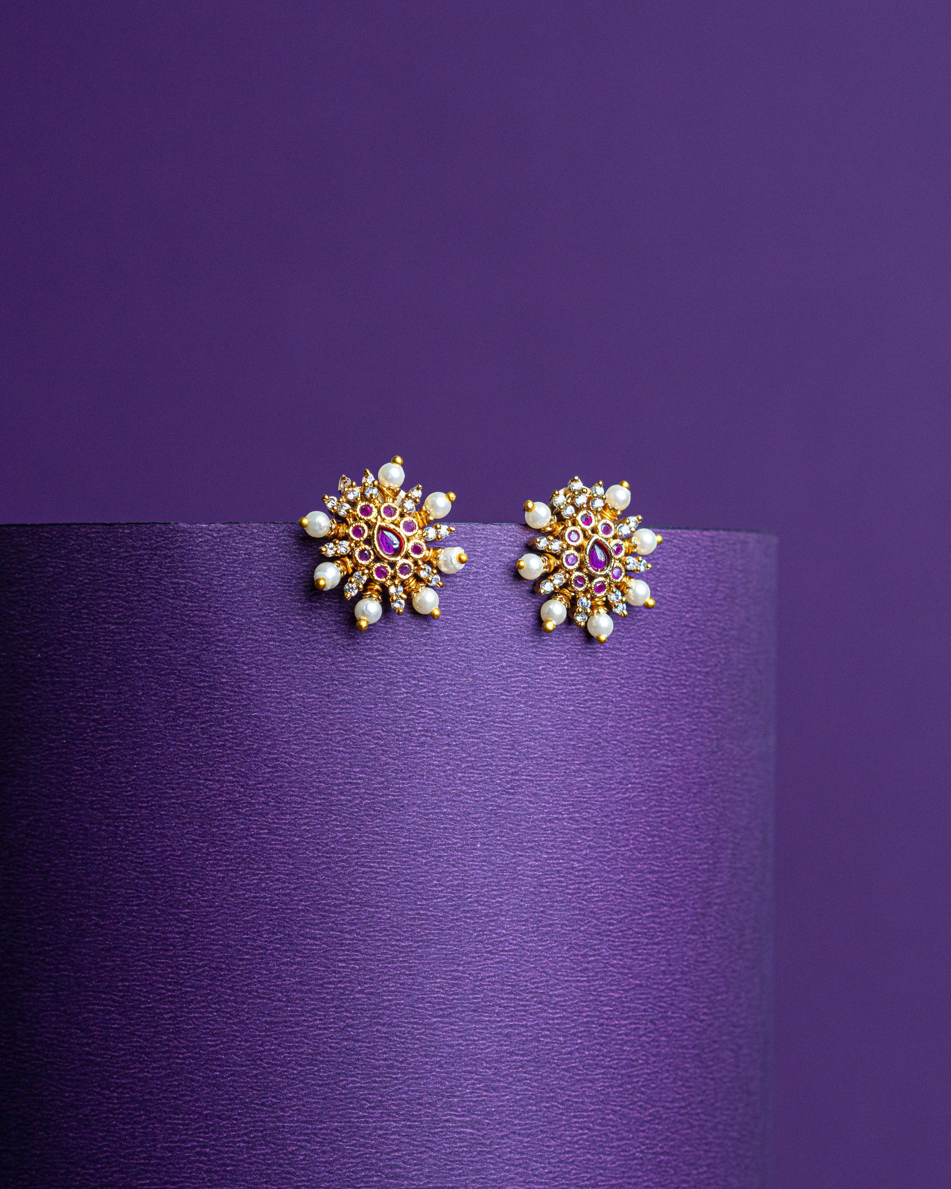 Elegant Stud Earrings with Pink Stones and White Pearls (Non-Gold)
