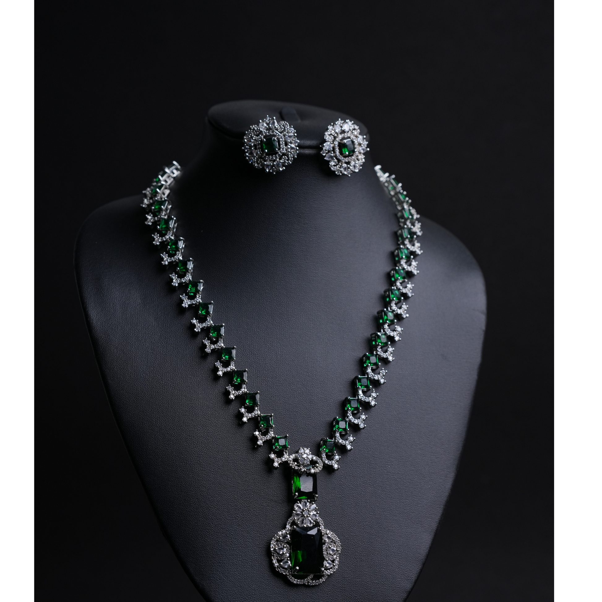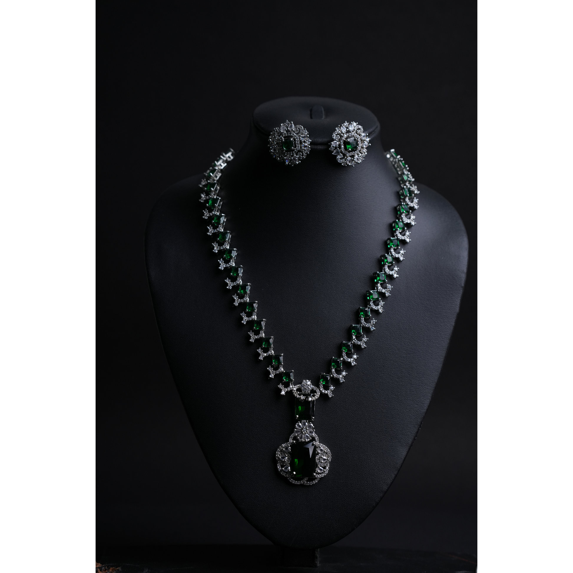 Neetha Ambani-Inspired Long American Diamond Necklace & Earrings Set with Green & White Stones