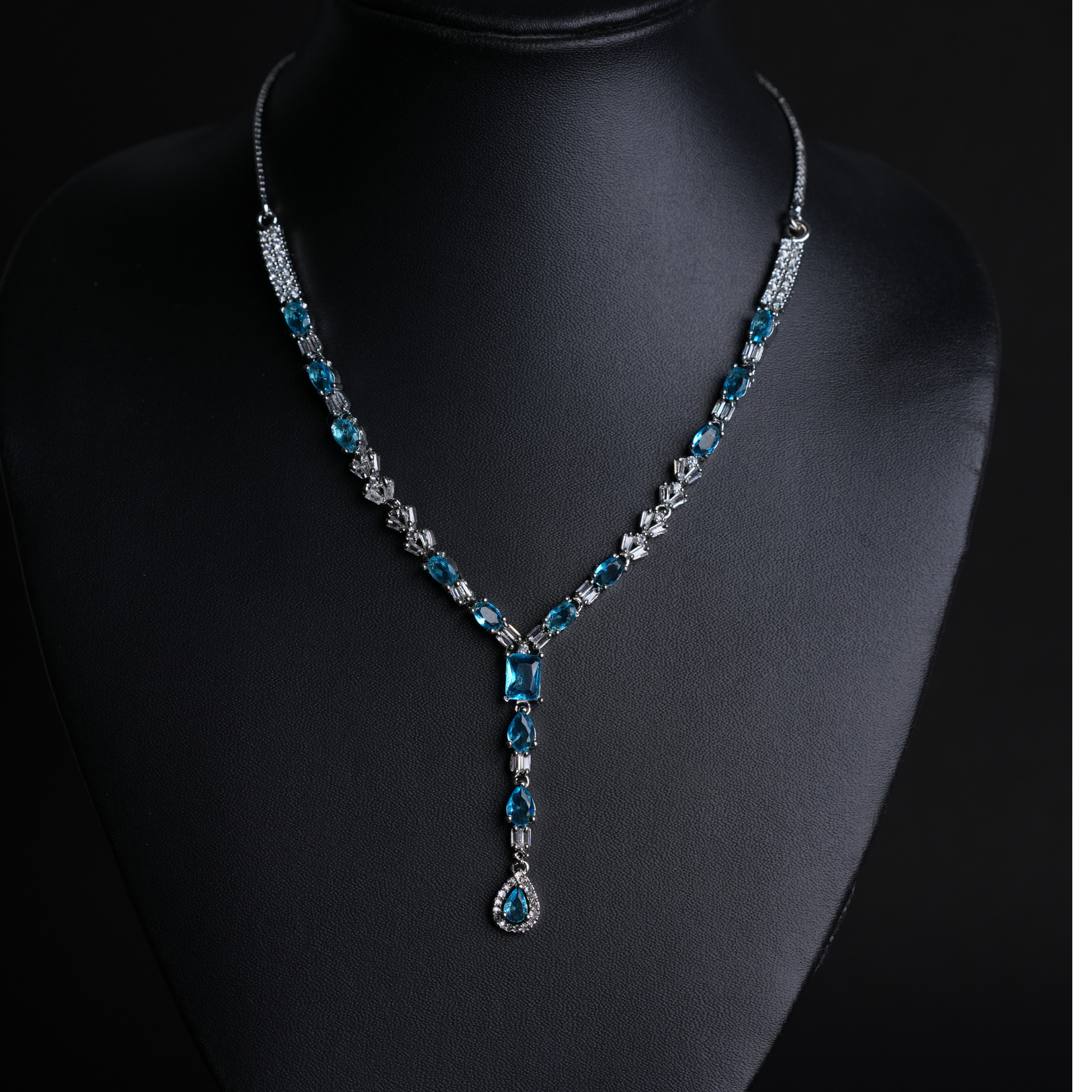 This sleek American diamond necklace and earrings set, featuring stunning Rama green stones, brings a perfect blend of elegance and modern charm to any occasion. Crafted with high-quality American diamonds, this set offers the brilliance of real diamonds at a fraction of the cost. The subtle yet striking green stones add a unique pop of color, making it a perfect choice for weddings, parties, or festive celebrations.
