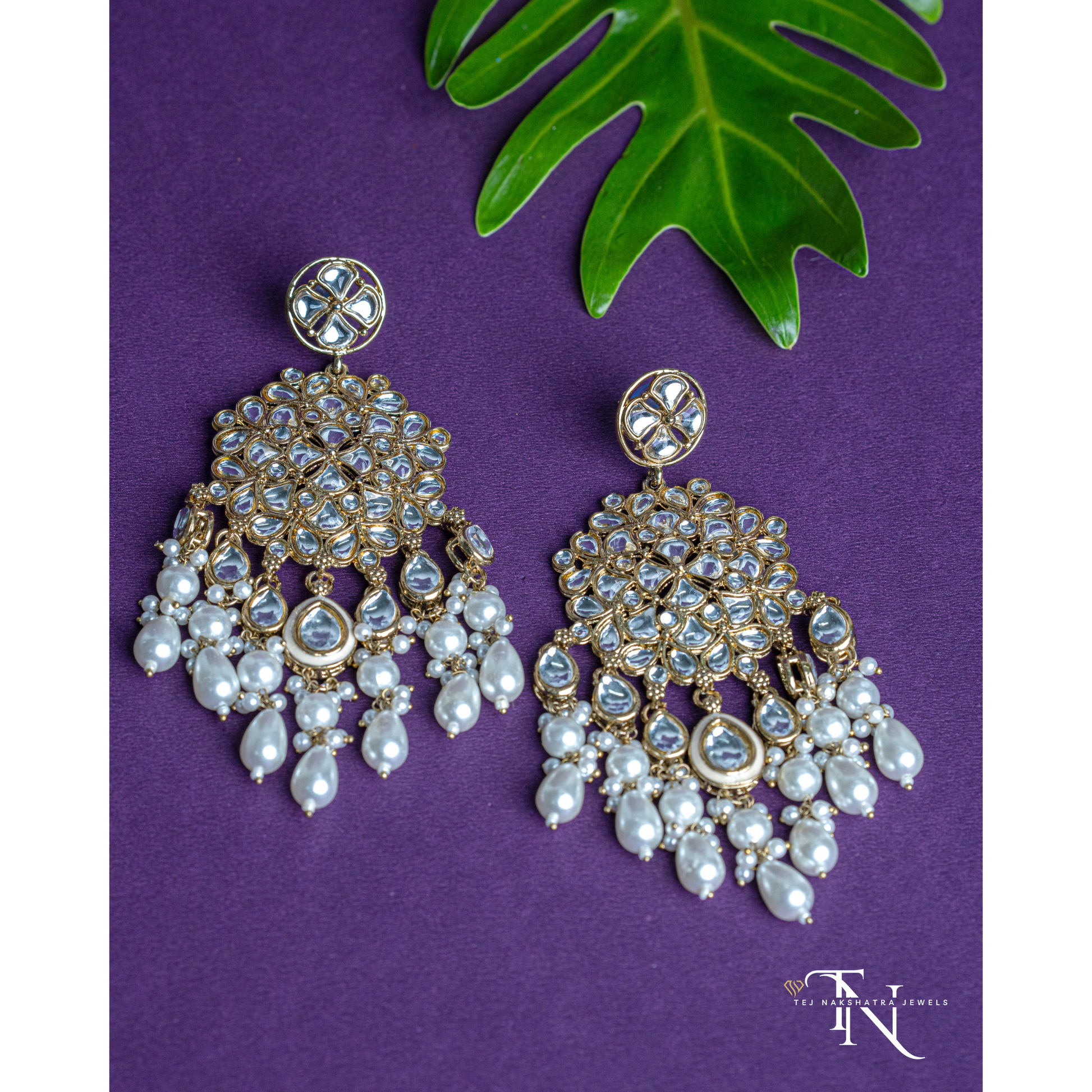 Make a bold statement with these large white kundan-embedded earrings, designed to add elegance and grandeur to any outfit. The intricate kundan work, with its stunning white stones, offers a regal, sophisticated look that’s perfect for weddings, festivals, or any special occasion. The large size of the earrings ensures they catch the eye and create a glamorous, bold statement while maintaining a timeless beauty.